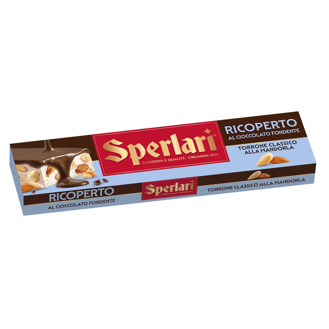 Torrone classico SPERLARI® alla mandorla ricoperto di cioccolato fondente. Da accostare al Moscato passito. Ottimo anche come ingrediente per torte, semifreddi, biscotti e cheesecake.