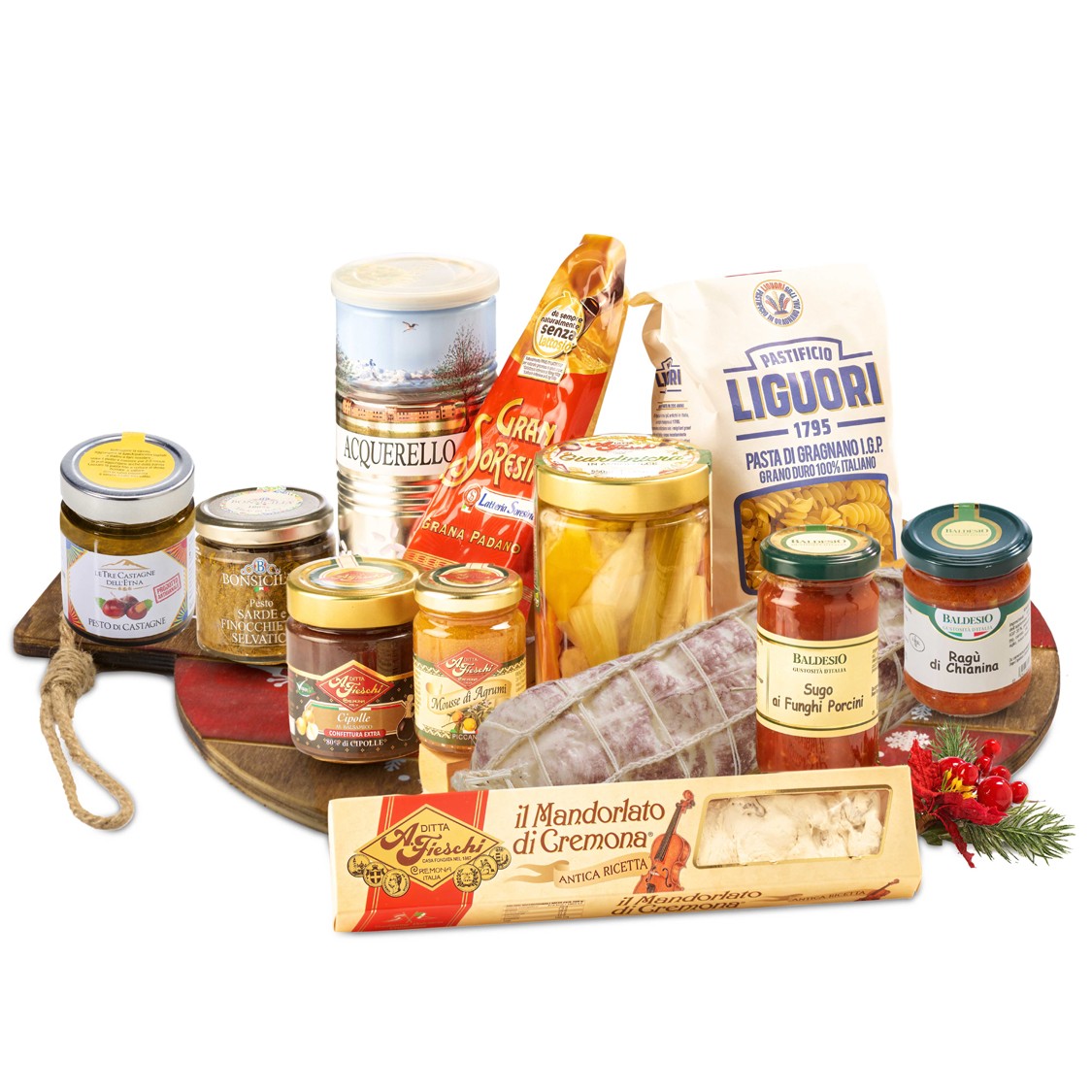 Nella nostra confezione regalo "TAGLIERE GOLOSO" trovi le specialità gastronomiche come la Mousse piccante di Agrumi FIESCHI 130g, il Riso Carnaroli ACQUERELLO® 500g, il Torrone Il Mandorlato di Cremona FIESCHI 150g, il Ragù di Chianina BALDESIO 180g, la Confettura extra di Cipolle al Balsamico di Modena I.G.P. FIESCHI 230g, lo Strolghino di prosciutto CA'Dell'ORA 200g ca., Il Grana Padano sottovuoto Latteria SORESINA 300g ca.,La Pasta di Gragnano trafilata al bronzo Antico Pastificio LIGUORI 500g, il Sugo ai Funghi porcini BALDESIO 180g, il Pesto di Castagne LE TRE CASTAGNE DELL'ETNA 190g.