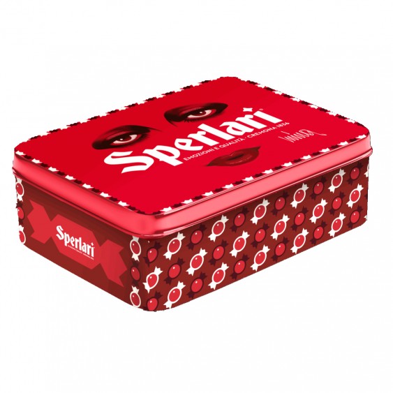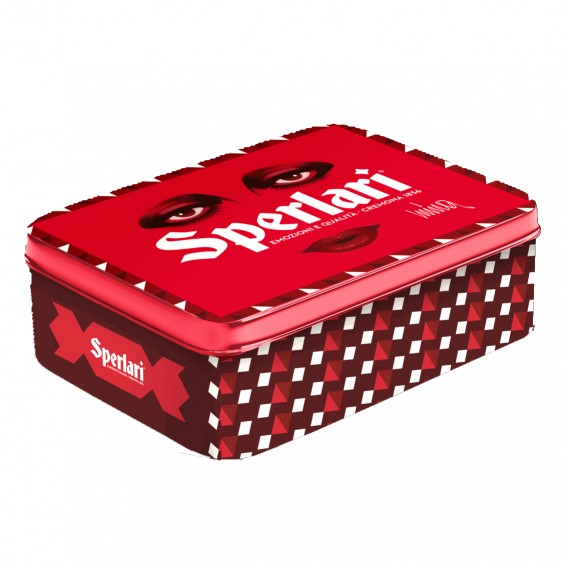L'iconica latta SPERLARI, con all'interno le Caramelle Gran Gelées Duetto, in edizione speciale firmata Mina.