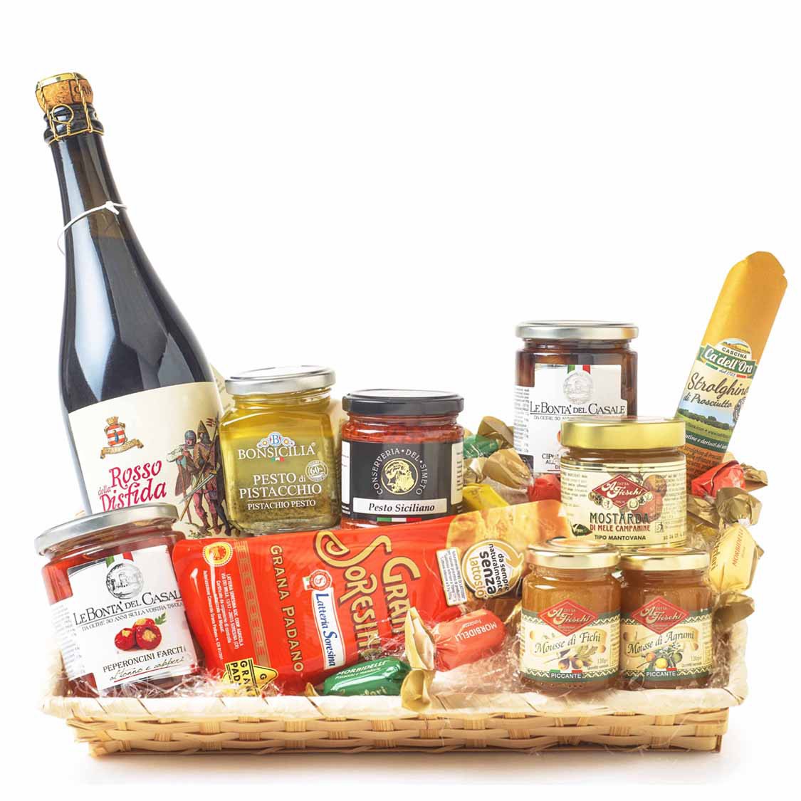 Nella nostra confezione regalo "SAPORI! " trovi le specialità come il Vino Rosso della Disfida Quistello IGP BALDESIO 750 ml, lo Strolghino CA' DELL'ORA 200g, Grana Padano sottovuoto LATTERIA SORESINA 300g, i Peperoncini farciti Tonno e Capperi BALDESIO 280g,il Pesto di Pistacchio BONSICILIA 190g, la Mostarda di Mele Campanine FIESCHI 260g, la Mousse di Agrumi piccante FIESCHI 130g, i Torroncini Morbidelli SPERLARI 130g.