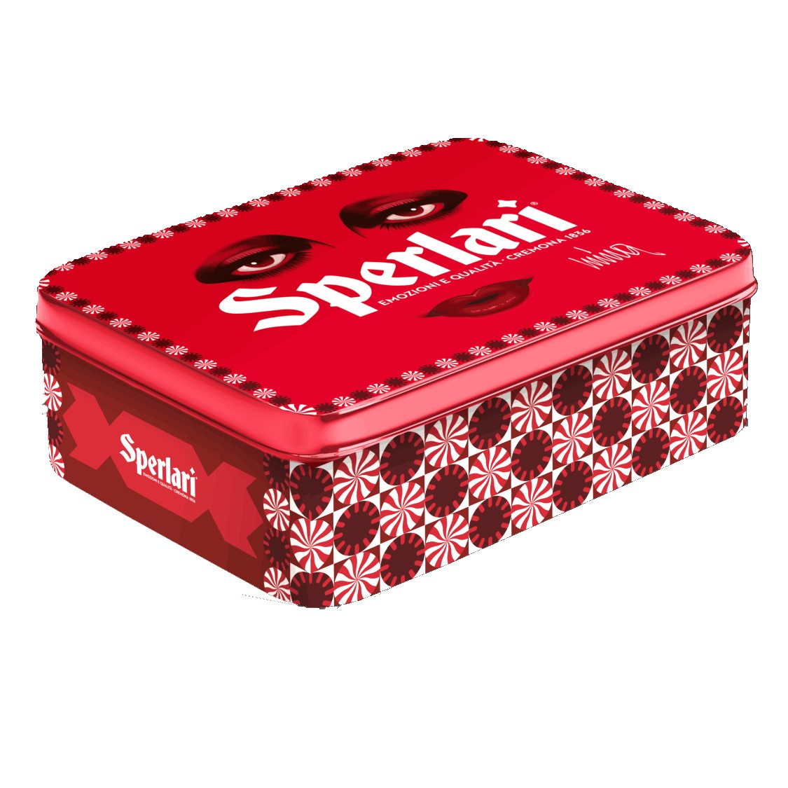 L'iconica latta SPERLARI, con all'interno i Morbidelli SPERLARI in edizione speciale firmata Mina.
