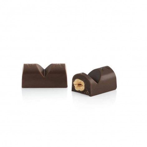 Due nocciole intere Piemonte IGP, provenienti rigorosamente dal territorio delle Langhe, incastonate in un guscio fondente 60%.