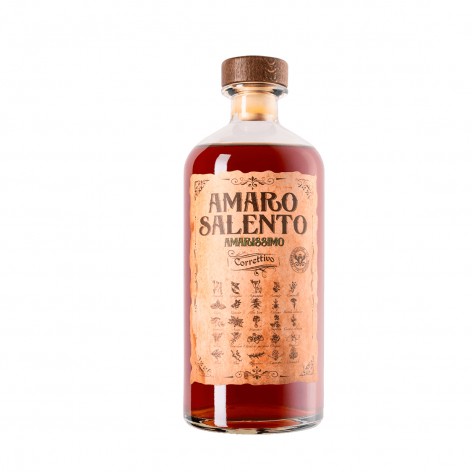 Amaro Salento Amarissimo Amaro Salento nasce a Veglie, nel cuore del Salento, dalla combinazione artigianale di erbe, radici, fiori, semi, rizomi, scorze e cortecce di antiche ricette tipiche di una terra magica, crocevia fra Oriente e Occidente, luogo d’incontro di molteplici popoli e culture. In esso sono racchiusi, con attenzione certosina e laboriosa, particolari e inconfondibili profumi e sapori che lo rendono unico. La versione “Amarissimo” ha un gusto forte e deciso che richiama il “fuoco dello Spirito”, correttore e purificatore del corpo e dell’anima. Si beve liscio, con ghiaccio, o in fantastici cocktails, è più forte del classico, con una bassa quantità di zucchero (0,7%).